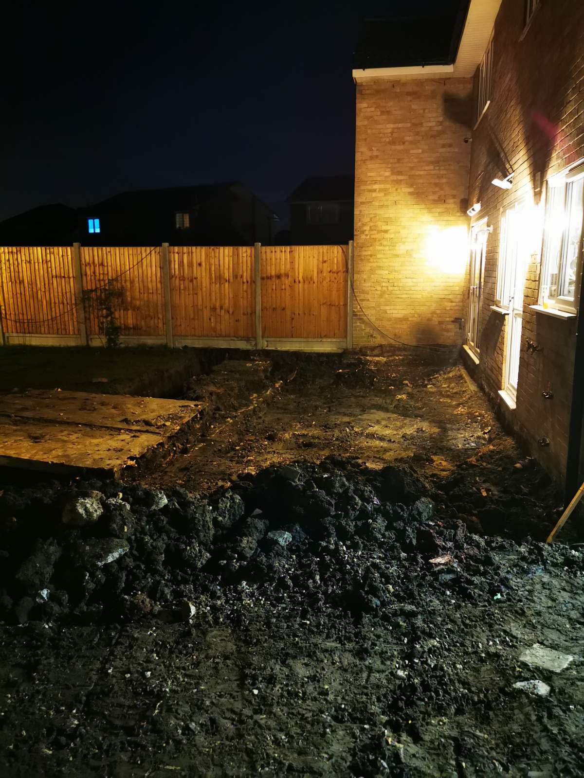 The photo shows the early construction stage, where we formed the new extension footprint, installed the damp-proof membrane, set out the service points, and poured the structural slab. All underground drainage and service runs were coordinated before the concrete was placed to ensure a clean and efficient build phase later on.