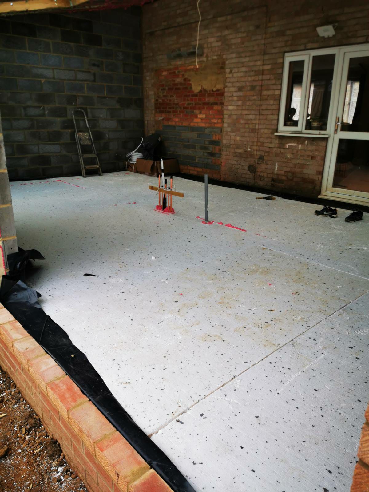 We began by forming the new extension footprint and preparing the ground for structural works. This included excavation, service trenching, and installation of a full damp-proof membrane. All drainage, waste outlets, and service penetrations were accurately set out before pouring the new reinforced concrete slab.